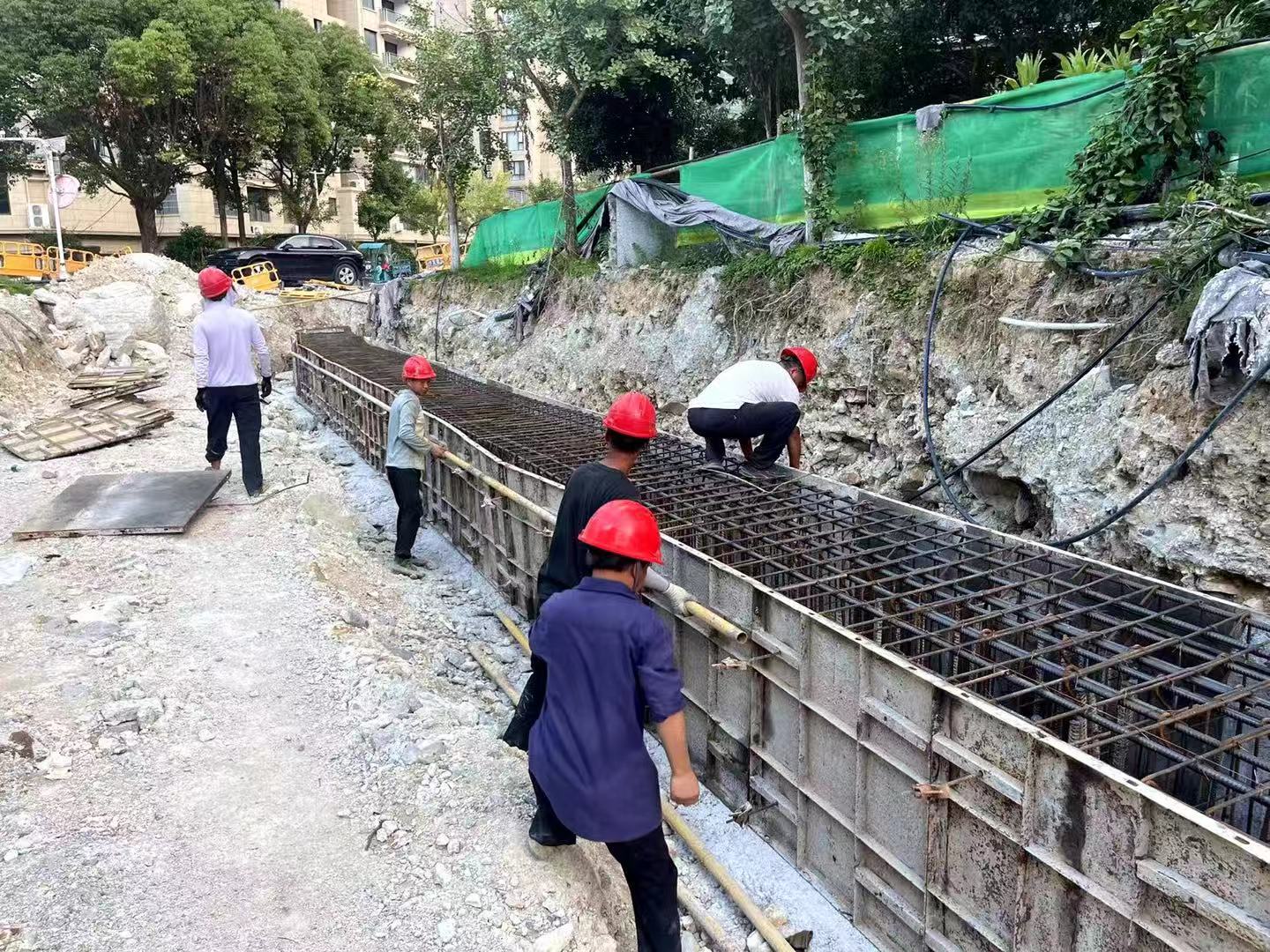 青田县油竹街道万基欧郡生活污水零直排项目-挡墙应急修复工程:抗滑桩全部施工完成,正进行圈梁钢筋绑扎施工中。