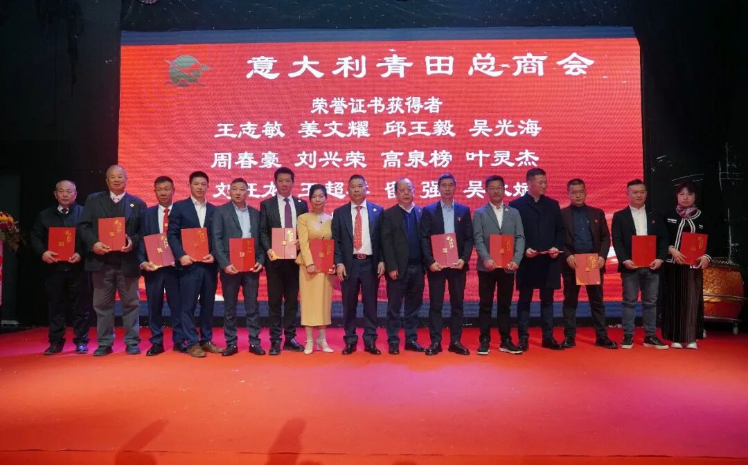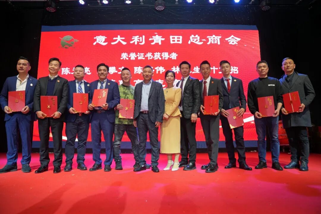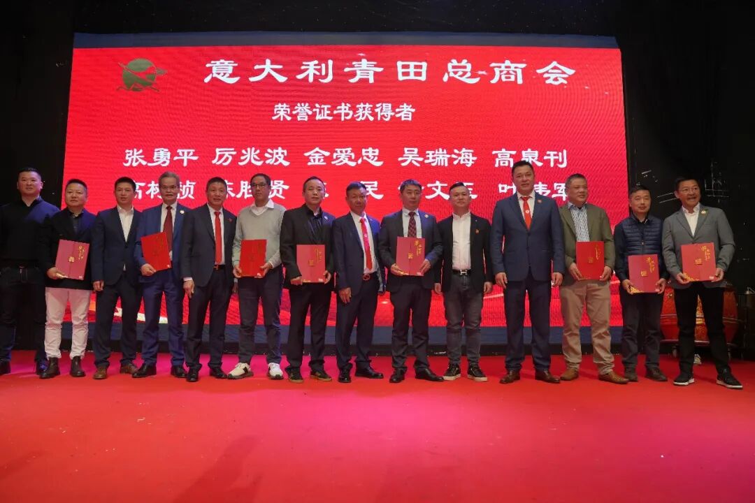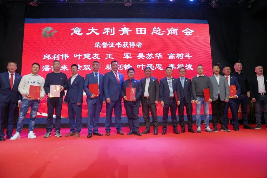 随后举行年会的重要环节——荣誉证书颁发仪式。商会永久会址的建设与发展凝聚了广大成员的智慧与奉献,是意大利青田总商会全体成员共同奋斗的重要成果。为表彰在商会建设、组织发展及公益事业中作出突出贡献的成员,商会分批向会长团、理事会、监事会及各部门负责人和骨干颁发荣誉证书。多位终身名誉会长、名誉会长及主要负责人担任颁奖嘉宾,现场掌声此起彼伏,充分体现了商会团结传承、同心同行的精神风貌。