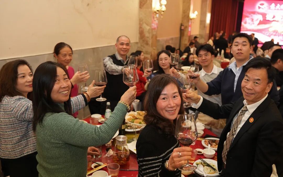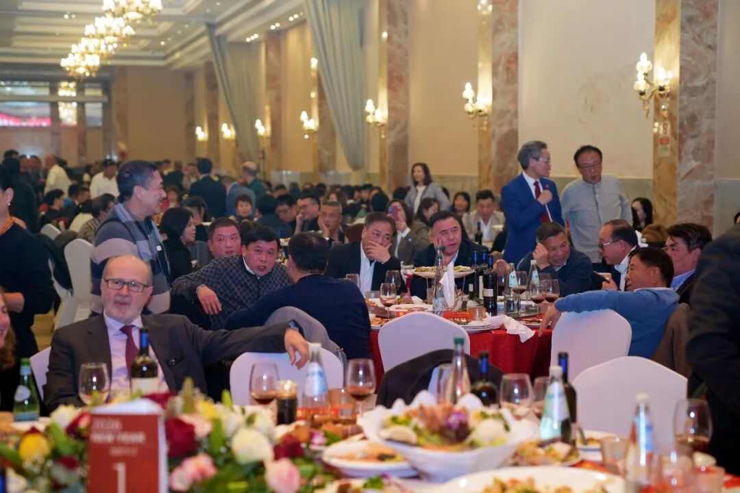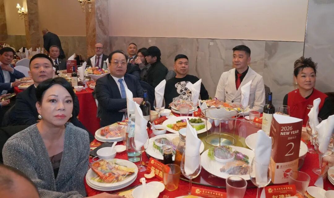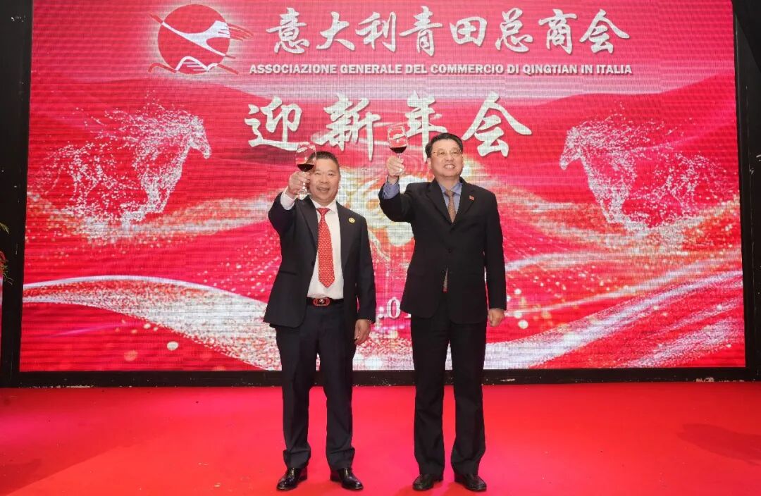 在喜庆氛围中,高泉他会长与刘侃总领事共同举杯祝酒,祝愿祖(籍)国繁荣昌盛、中意友谊历久弥新,并祝福意大利青田总商会在新的一年里再攀新高、再创辉煌。全场嘉宾同举酒杯,将年会气氛推向高潮。