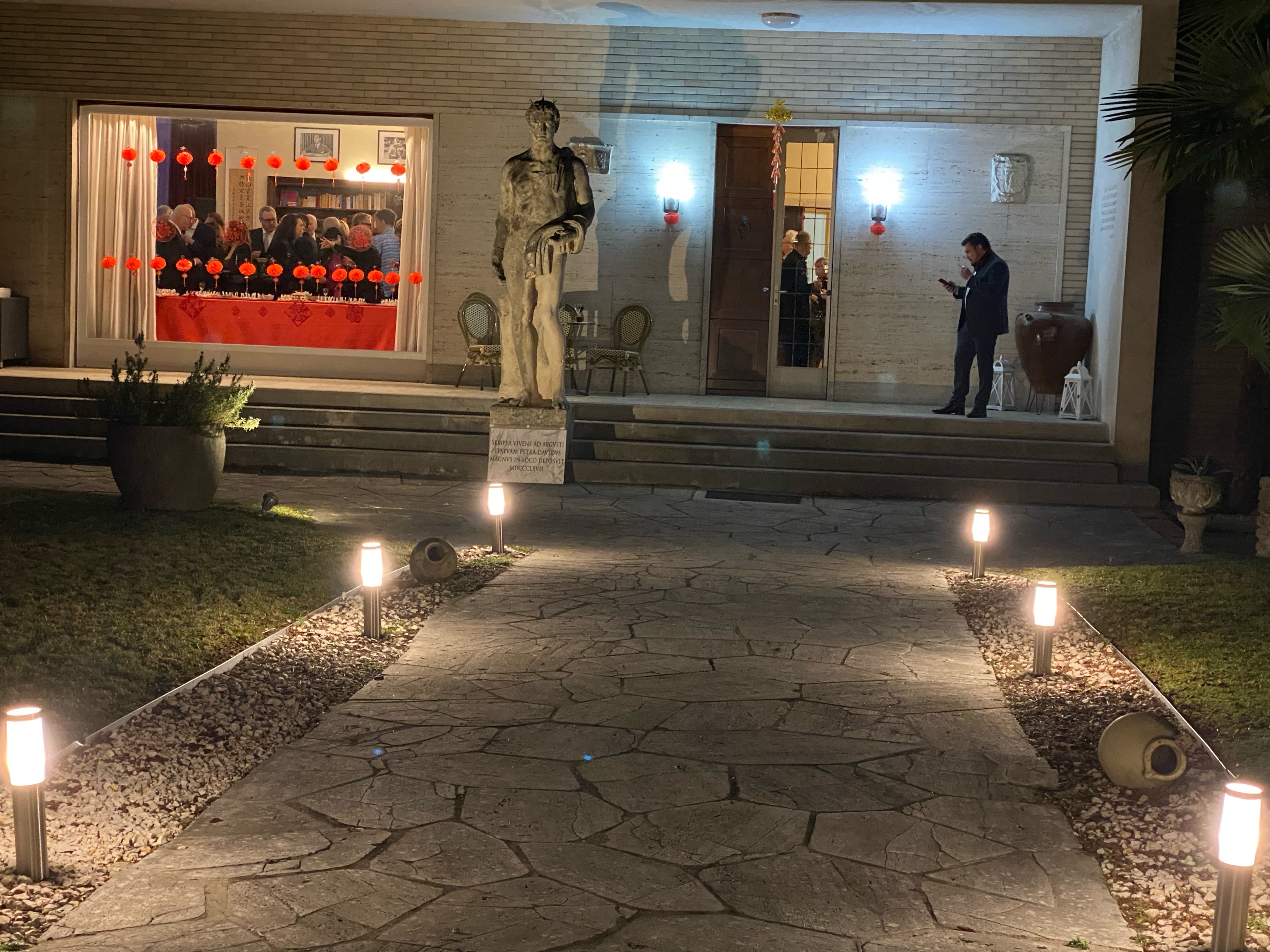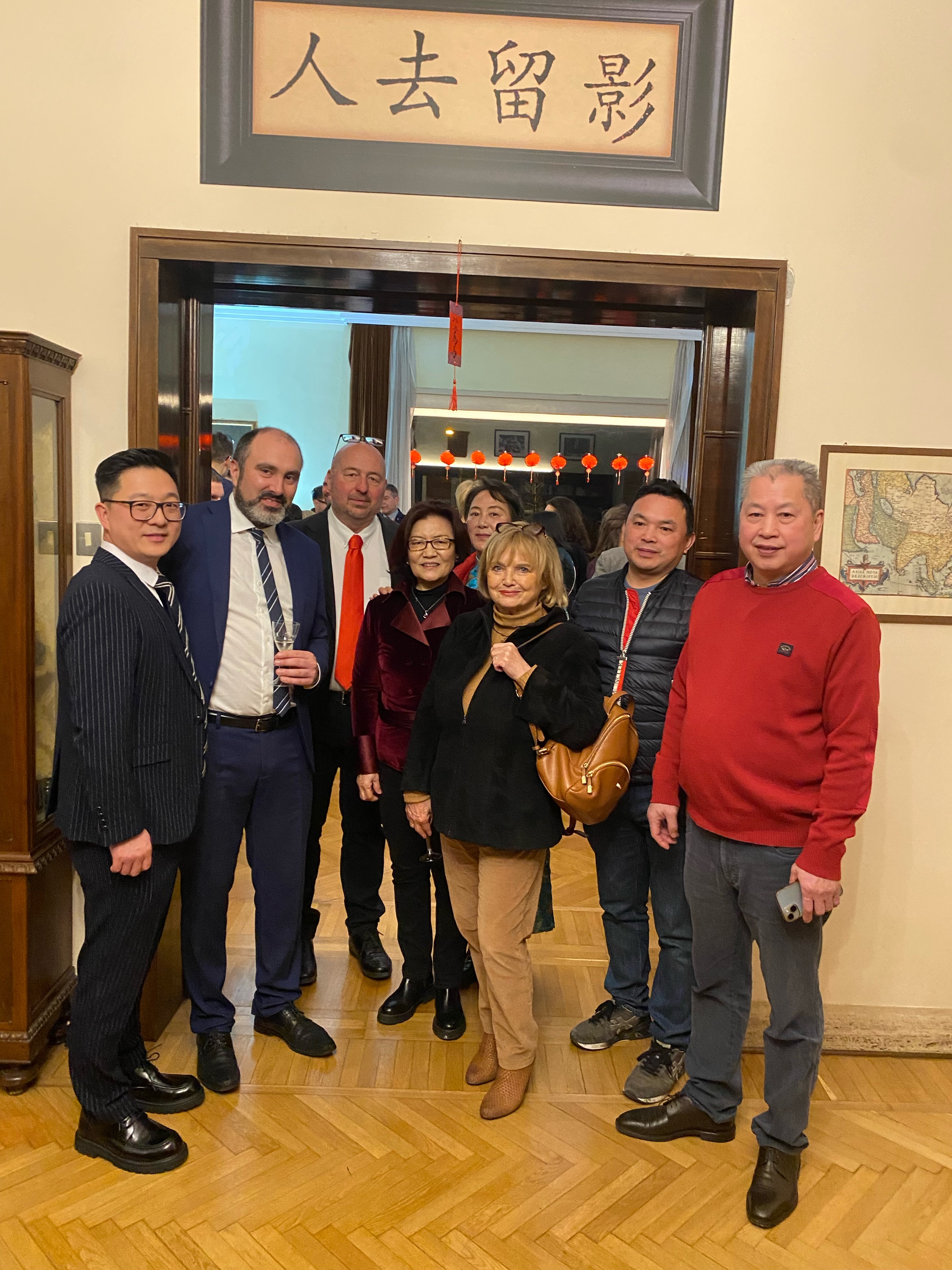 晚会在戈里齐亚市大卫·奥奖赞𡋾墅举行。红灯笼高挂的别墅,到处挂满中国名人图片、书法和风景照;壁厨里中国瓷器、文物和书籍琳琅满目;特别显眼的中国家具和大花瓶让整座建筑尽显中国风情。