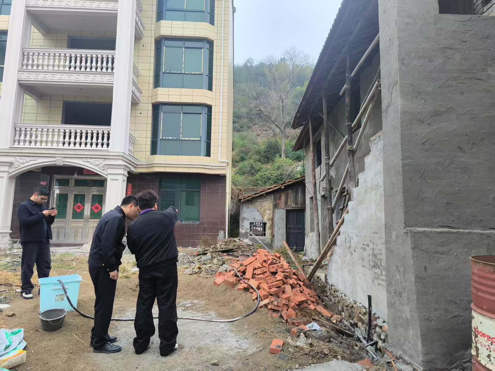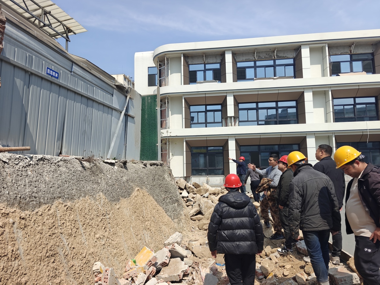 镇党委副书记杨少军与经开投公司、施工单位现场协调沟通中心幼儿园新建工程周边围墙建设方案。