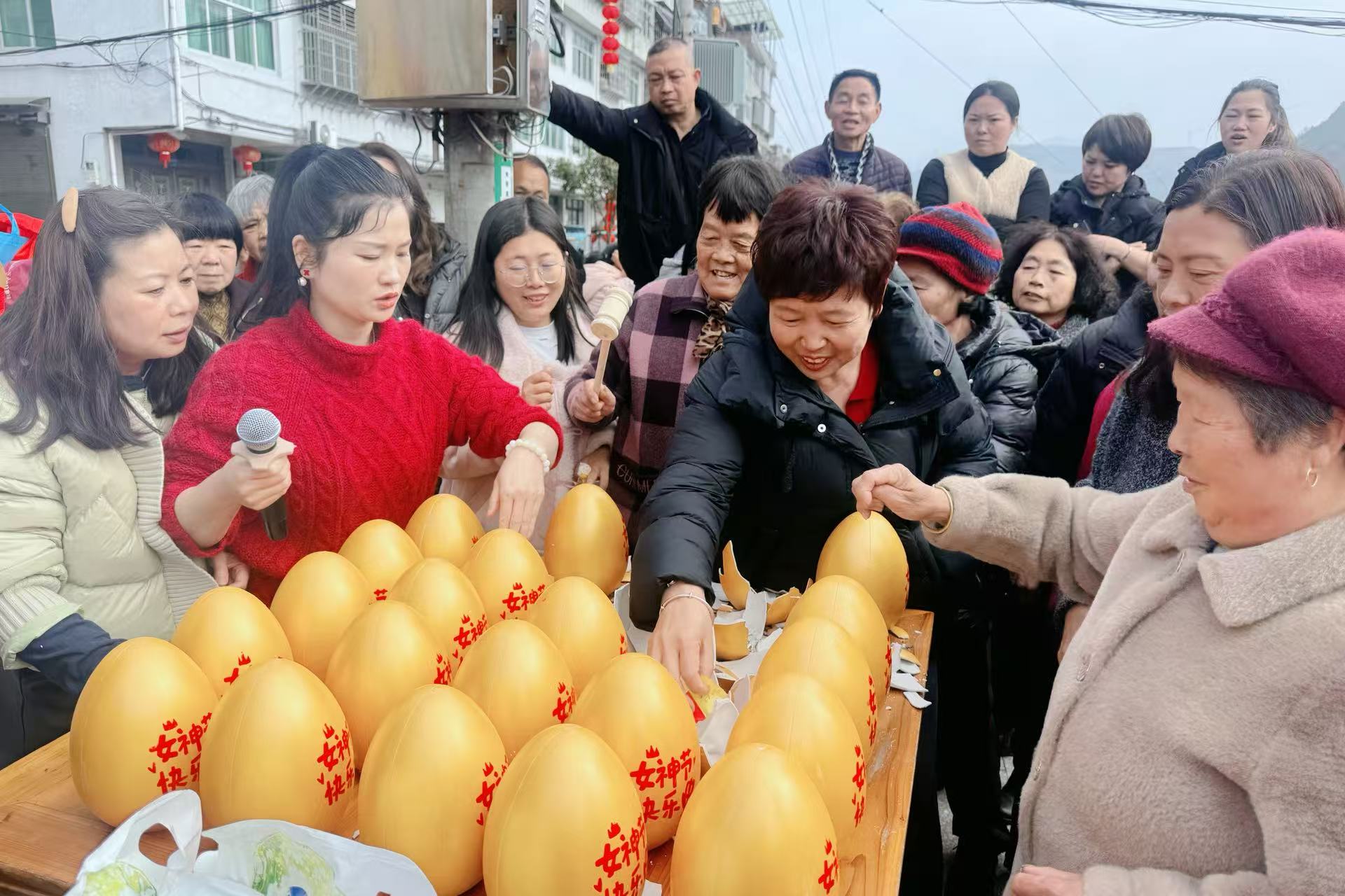 活动中,热闹的广场舞拉开序幕,姐妹们身着彩装、踏歌起舞,以饱满热情展现新时代农村女性的活力与风采,现场还设置了趣味小游戏环节,投壶、砸金蛋等项目吸引大家踊跃参与,欢笑声此起彼伏。村民们一边品尝着山粉糊、油条等传统美食,一边拉家常、话里短,在美食飘香中感受“和谐”“友善”的温暖力量。整个活动现场洋溢着喜庆、温馨、和谐的节日氛围。