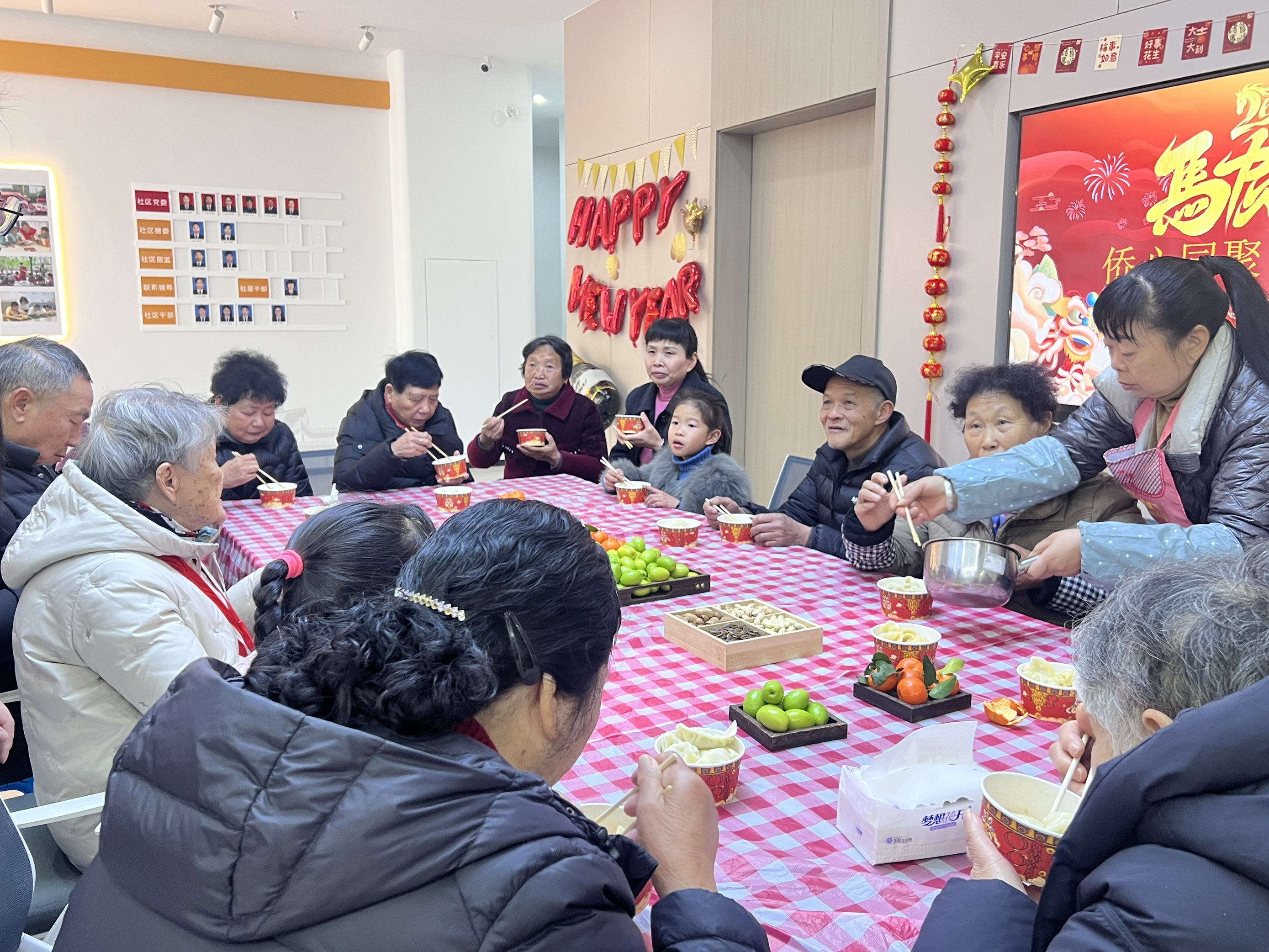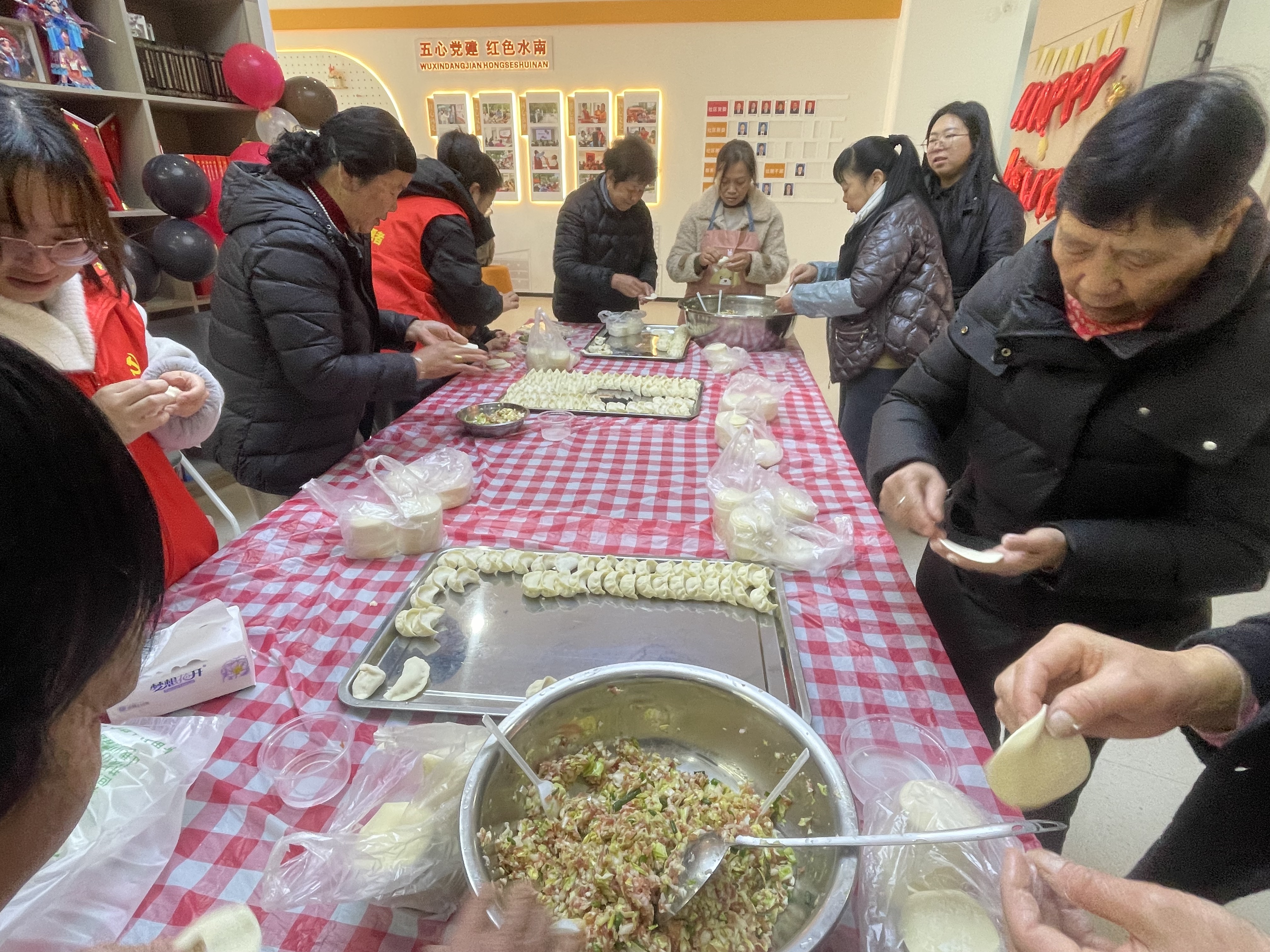 活动现场暖意融融、年味十足。党员志愿者提前备好面粉、馅料、案板等食材,老人们围坐在一起,拉家常、话新春,分享生活点滴与侨乡趣事,志愿者们耐心倾听老人们的心声,细致询问他们的生活状况,及时了解需求、跟进帮扶。