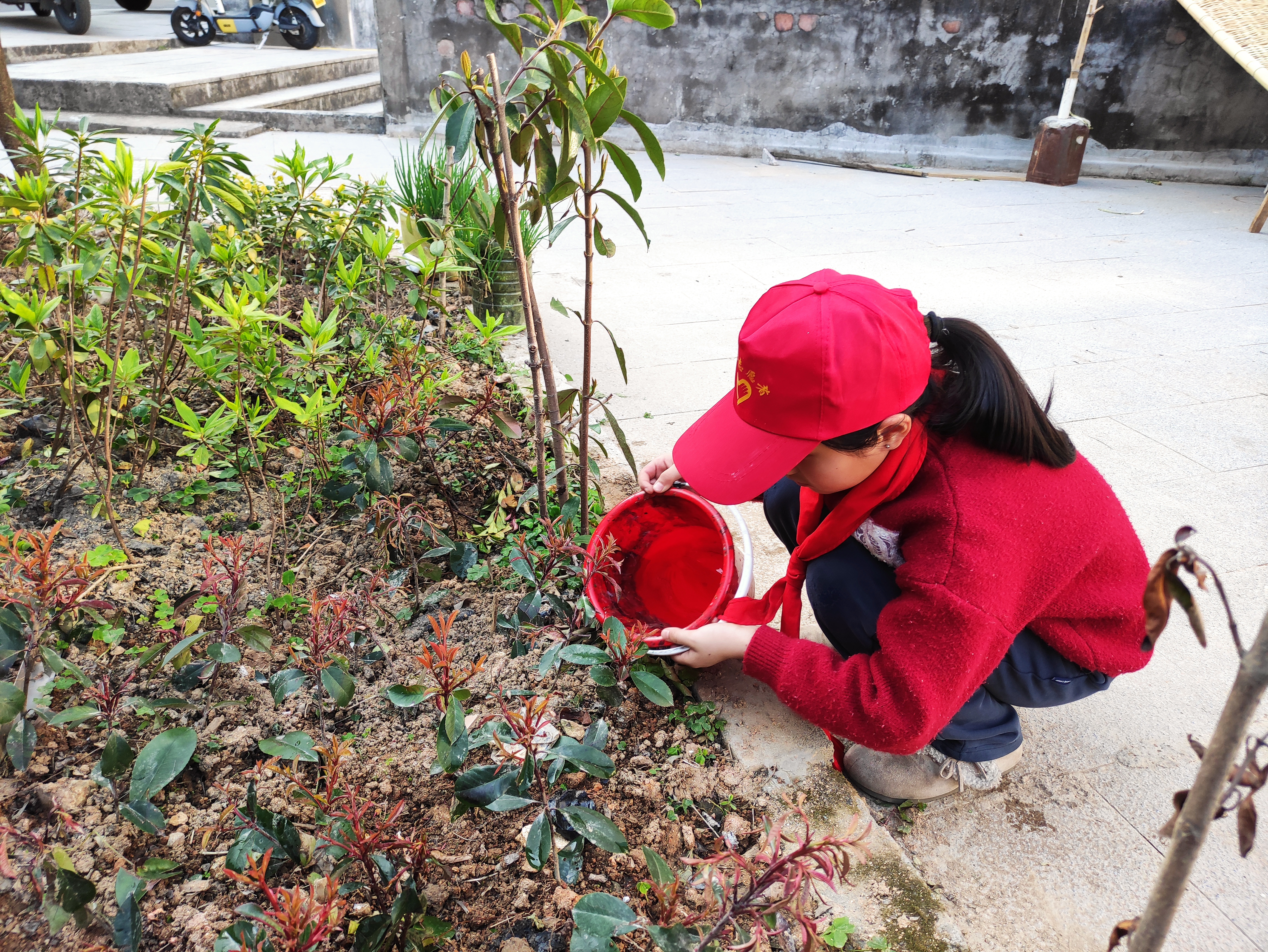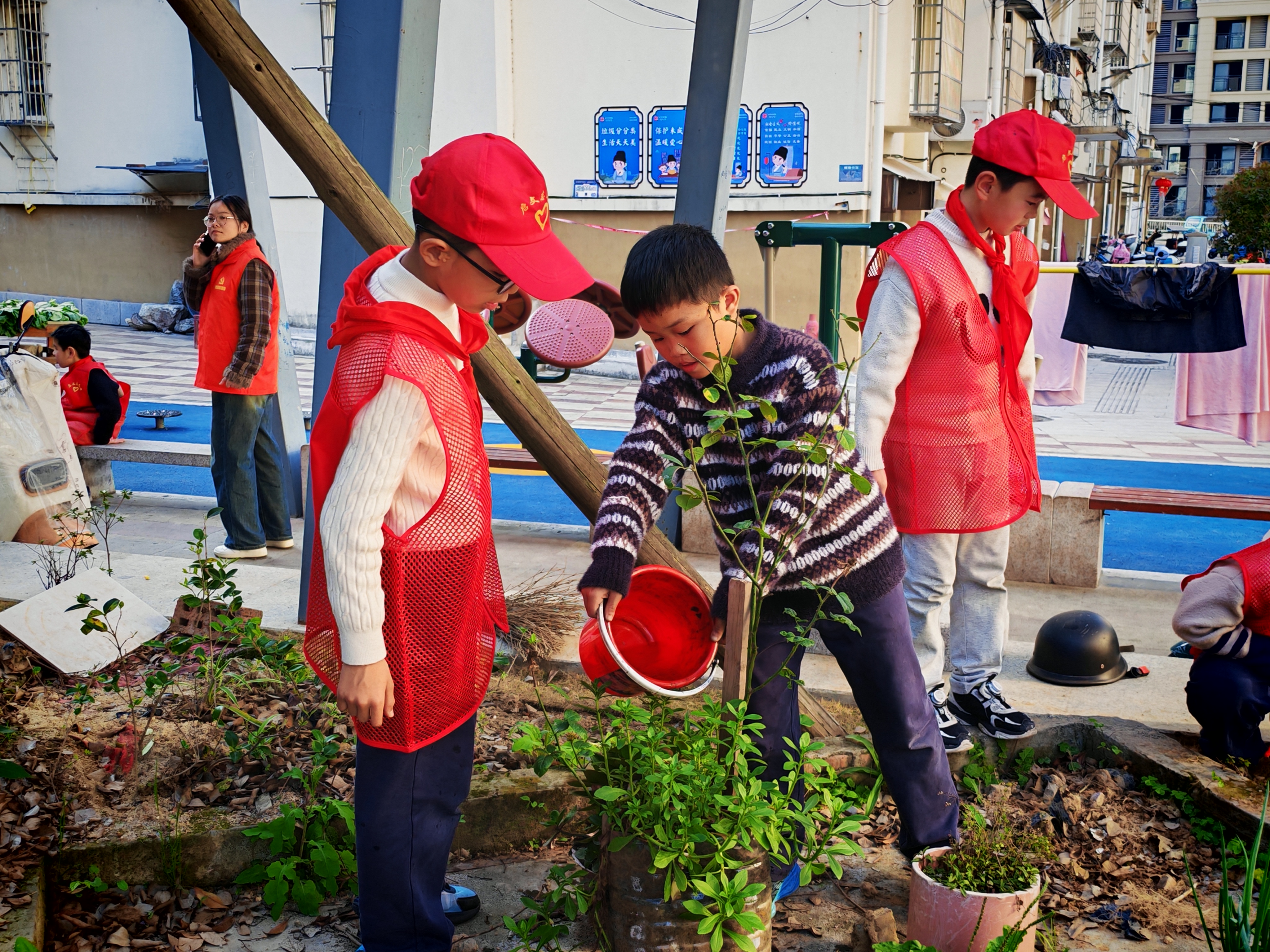 活动现场,社区工作人员提前划分专属绿化区域,命名为“红领巾责任田”,将植绿护绿与文明城市创建的要求深度融合,让这片小天地成为孩子们践行文明理念的实践阵地。启文实验学校的同学们佩戴红领巾,带着水桶、小铲子,满怀热情前往朝阳小区,在社区工作人员的指导下,认真学习浇水、除草的正确方法,在劳动中树立绿色环保的文明意识。孩子们纷纷认领专属 “责任田”,郑重许下养护承诺,主动承担起绿植日常浇水、除草任务,用实际行动践行劳动责任,诠释红领巾的担当,更以点滴行动为文明城市创建添砖加瓦。