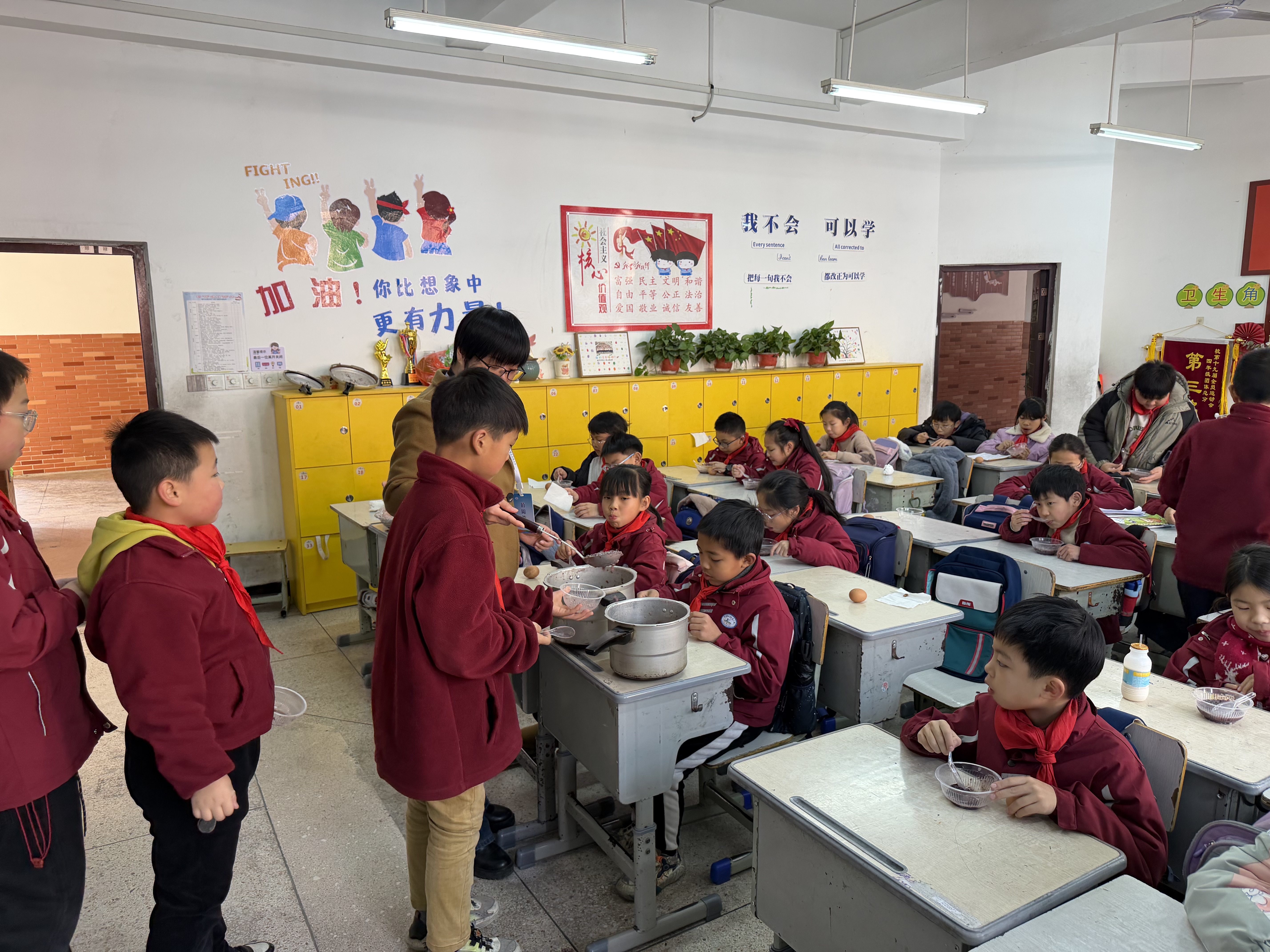 农历腊月初八,寒意未消。油竹小学的清晨,被一阵熟悉的甜香温柔地唤醒。官塘社区志愿服务队的成员们,踏着晨雾,将满载心意的腊八粥和茶叶蛋送进校园,这不仅是一份节日早餐,更是一场关于分享、传承与爱的温暖实践。