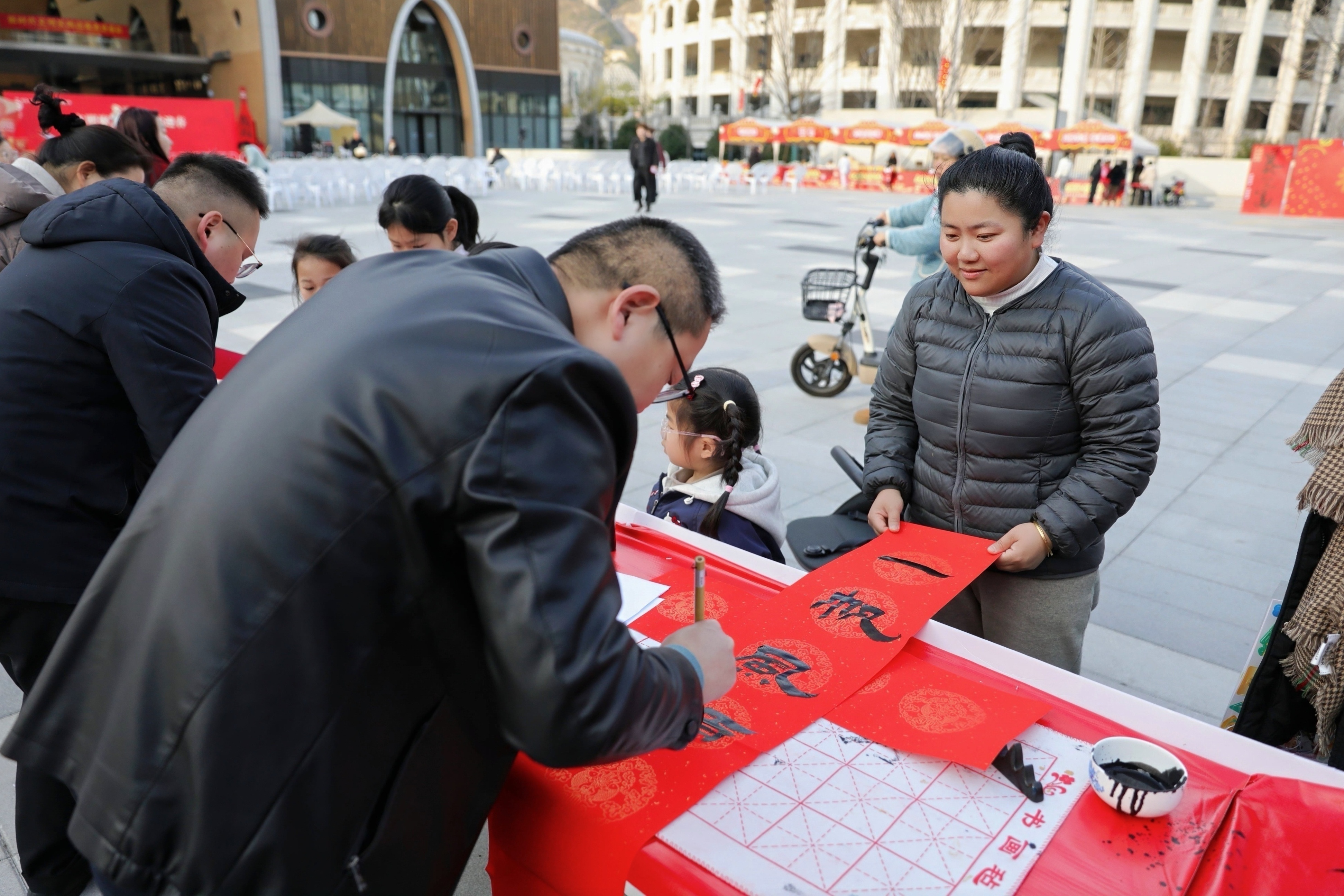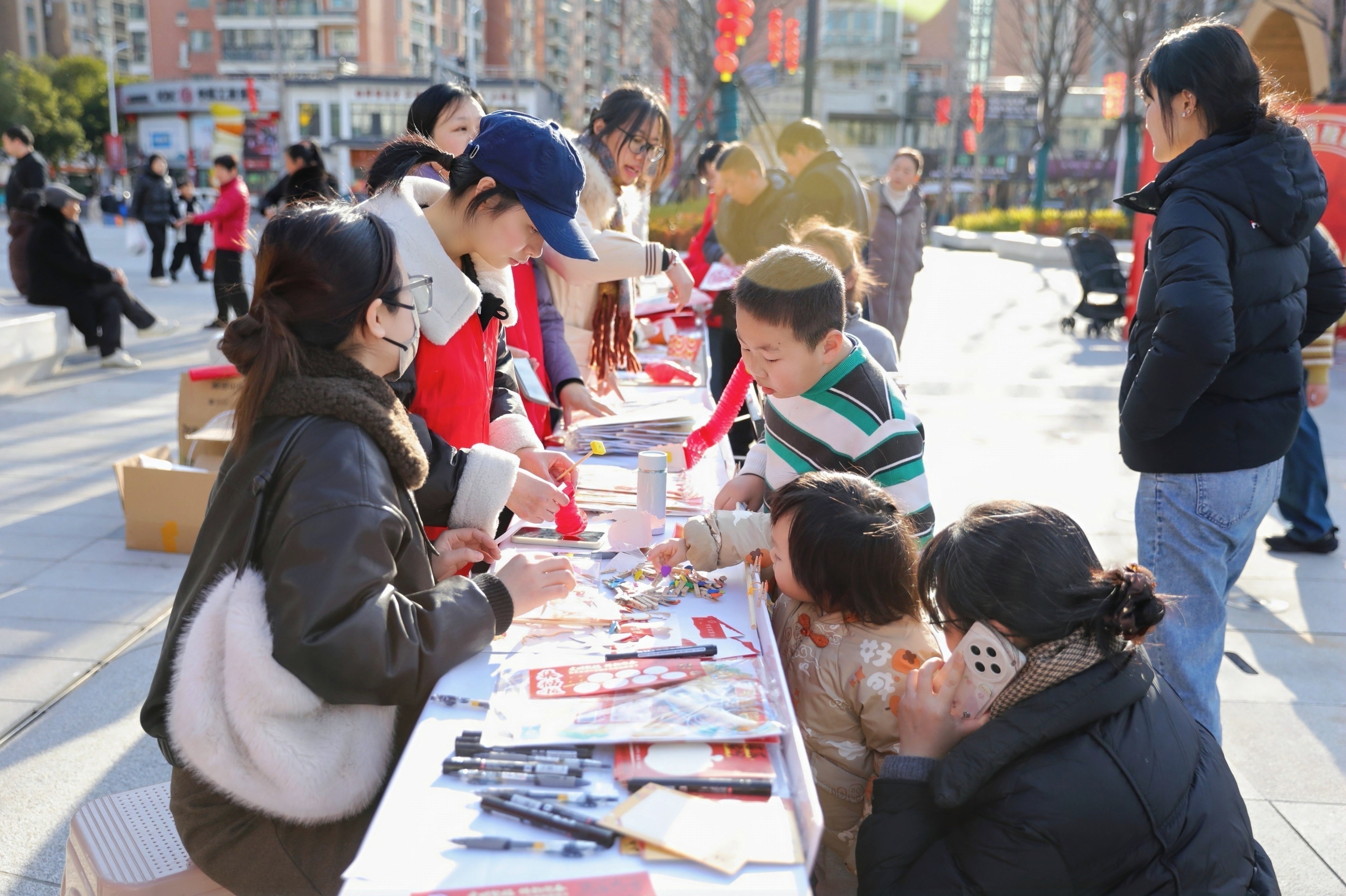 午后阳光和煦,活动现场暖意融融、年味浓郁。冰糖葫芦晶莹剔透,爆米花带来熟悉的焦香、糖画栩栩如生;现打的年糕、软糯的麻糍、蓬松的米花棒,每一口都是地道的乡土记忆,吸引着居民驻足采购。而在另一侧,“1元全家福”的镜头前,无数家庭整理衣衫,绽开笑容,将团圆的瞬间定格为永恒;免费理发摊位旁,银发老人们边话家常边享受服务,暖意融融。手作区里,墨香四溢,书法爱好者挥毫书写春联一副副笔力遒劲、寓意吉祥的春联跃然纸上;孩子们则用马年吉祥物的特色图案拓印红包,将年味握在手中。