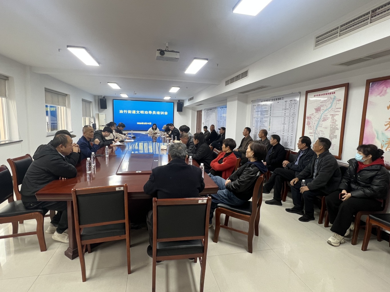 3月19日下午,油竹街道召开文明劝导员培训会。会上明确了劝导员工作职责,并对工作时间、着装规范及工作要求进行统一,全力备战实地测评。会议强调,劝导员需严守纪律、文明引导,以专业形象劝导不文明行为,助力提升辖区环境秩序,展现良好城市形象。此次培训有效强化了劝导员的责任意识与服务意识,为在实地测评中展现街道文明形象、营造整洁有序的城市环境奠定了坚实基础。