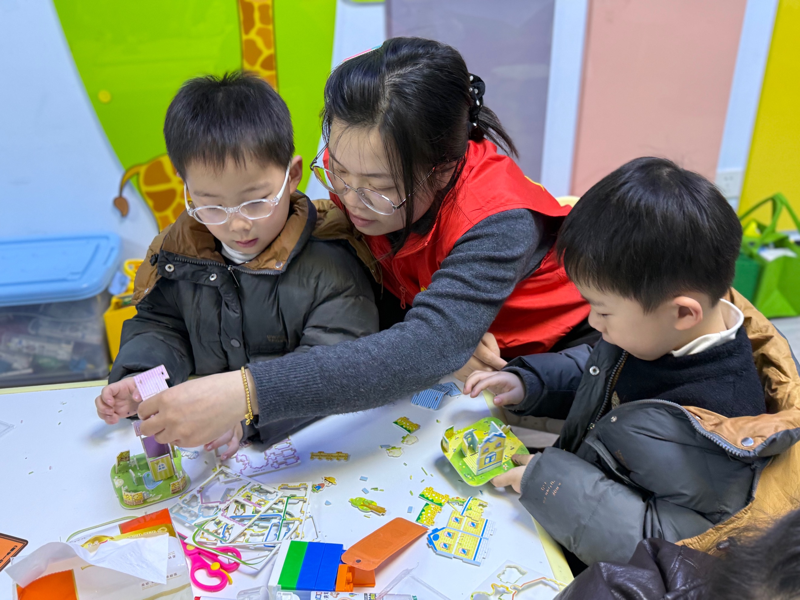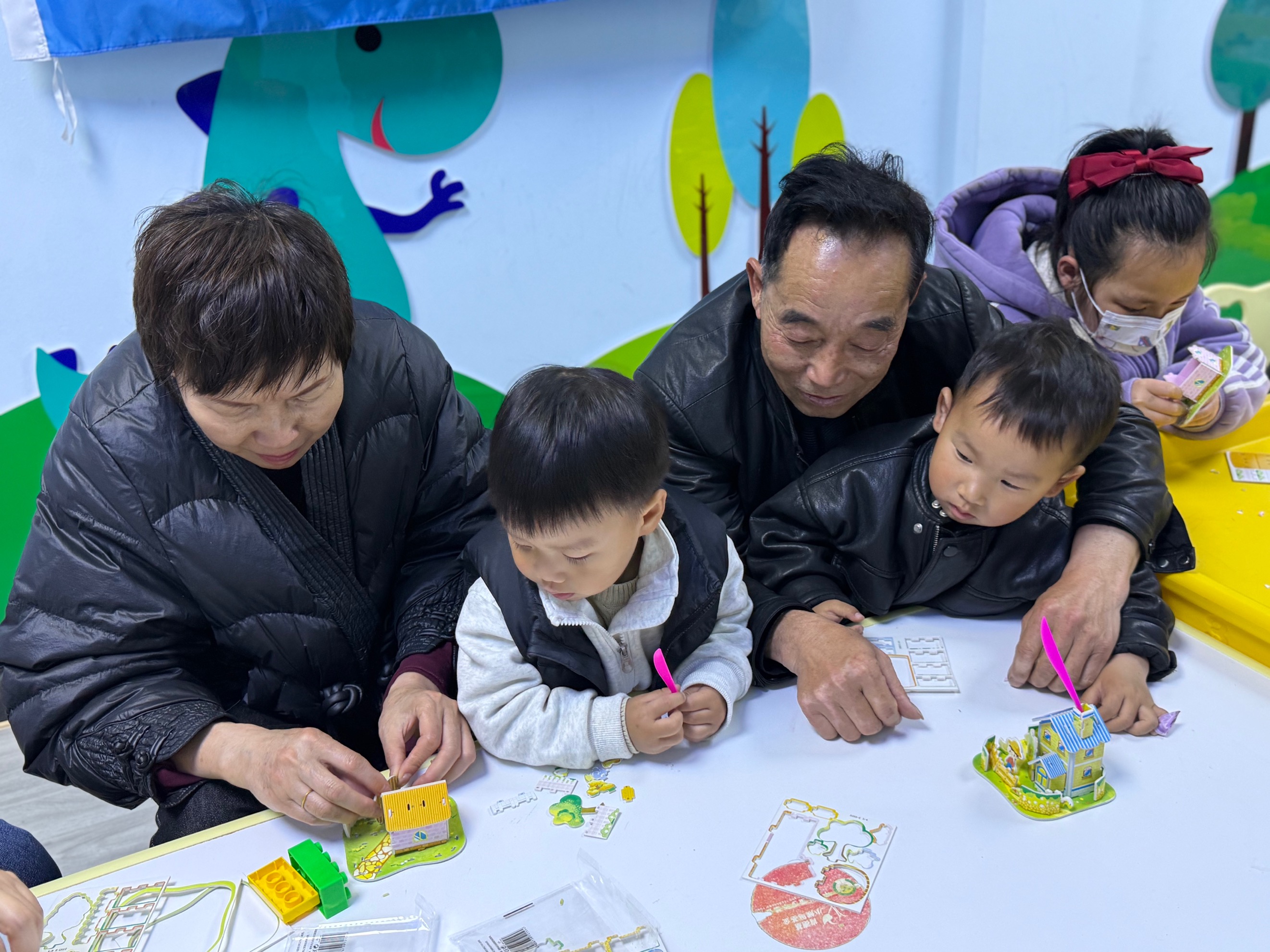 活动现场,孩子们在家长和志愿者的陪伴下,认真投入到手工拼图的创作中。从色彩辨认、形状匹配到耐心拼接,孩子们在指尖的专注中锻炼了观察力与动手能力,家长们则在一旁悉心引导、协作配合,现场氛围温馨融洽。一幅幅由亲子共同完成的手工拼图作品,不仅展现了孩子们的巧思与创意,更成为亲子协作的美好见证。